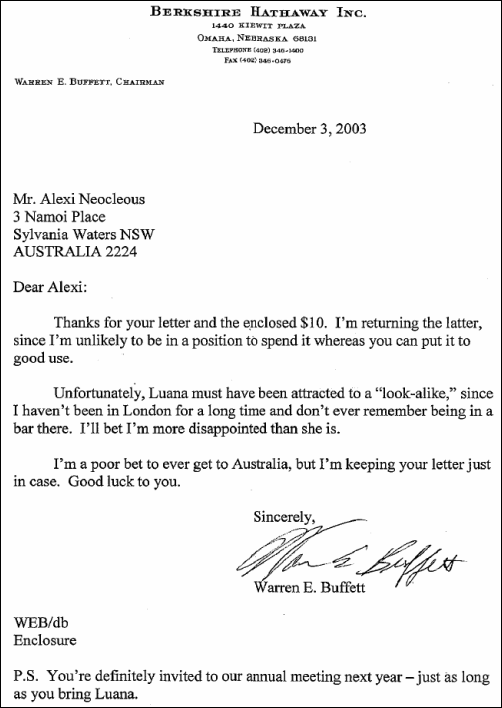 Buffett. Mr Buffett received one of Alexi's sales letters and invited him to be